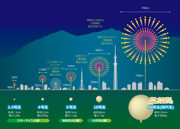 지난번 불꽃놀이 구슬의 크기를 간단히 소개해 드렸습니다만, 사이즈 4호 구슬은 직경이 12cm , 사이즈 10호 구슬은 직경이 30cm 정도입니다. 상공에서 터지는 불꽃의 크기를 크게 하기 위해서는 구슬 사이도 커져야 하는데, 4호 구슬의 경우, 상공에서 터지면 그 길이가 110m 정도이며, '츠치우라 불꽃놀이'에 사용한 10호 구슬의 경우, 불꽃크기가 300m에 달합니다. 그러므로 구슬이 클수록 넓은 하늘 공간이 필요하며, 더 높게 발사해야 합니다. 참고로 세계에서 가장 큰 불꽃은 구슬은 '니가타'( 新潟:Nigata) 현에서 개최되는 '가타카이'(Gatakai) 축제에서 발사되는 '사이즈 40호 구슬'로 직경이 1.2m이며 무게도 400kg이 넘습니다. 상공에서 불꽃이 터지면 직경이 700m 이상 커다란 국화 형상의 불꽃이 펼쳐집니다.