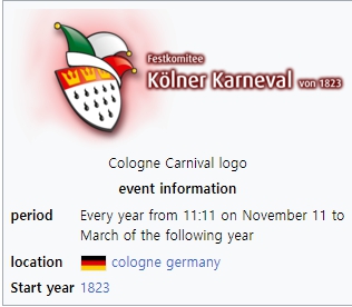 독일의 '쾰른 카니발'은 유럽의 3대 카니발은, 이탈리아의 '베네치아 카니발', 프랑스의 '니스 카니발', 그리고 독일의 '쾰른 카니발'입니다. 해마다 '11월 11일 11시 11분'에 카니발의 개막을 선포한 뒤 다음 해 3월까지 기나긴 기간 동안 개최되는 축제입니다. '11'이라는 숫자는 '광대를 의미하는 숫자'이므로 시민들은 화려한 광대 복장을 하고 '쾰른'시의 '알트마르크트'광장에 모여 'Kolle Alaaf'( 퀠러 알라프)를 외칩니다. 이 말은 '쾰른이여 영원하라'을 뜻하는 말입니다. 카니발은, 예수 그리스도의 부활과 관련이 있으며 '금욕'과 '절제'를 하는 시기인 '사순절'에 앞서 마음껏 먹고 즐기는 축제입니다. 이 축제는 기독교 전통의 축제이며 종교적 의미를 넘어 사회통합적이면서 독일 문화와 전통을 즐기는 행사라고 볼 수 있습니다.