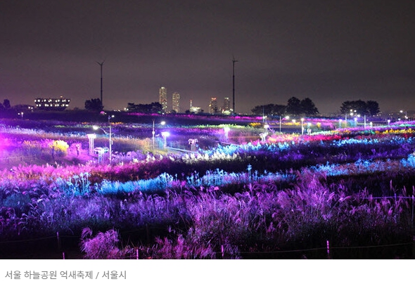 - 라이팅 쇼 : 10월 15일(일) ~10월 20(금) 하늘공원 중앙무대 → 은빛과 금빛으로 이루어진 억새와 조명과 음악이 어우러져 신비하고 화려한 야경을 보실 수 있습니다. 어디 곳에서 든 포토존에서 찍은 것 같은 연출 사진의 연속.