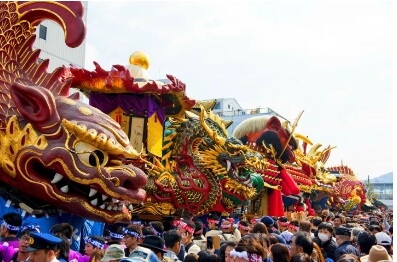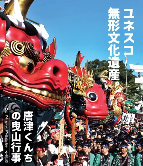 에도시대( 1603~1867)부터 400년이 넘는 세월 동안, 풍부한 수확의 계절에 가을을 축하하고, 추수 감사의 의미가 담겨있으며, 신에게 감사를 드리는 축제입니다. '카라츠 쿤치 축제'는 11월 초 3일간 열리는 대규모 행진이 있는 축제로서 '카라츠 신사'에서 시작해 '히키야마'라는 거대한 수레가 마을을 지나 '니시노 해변'까지 돌아오는 축제입니다.