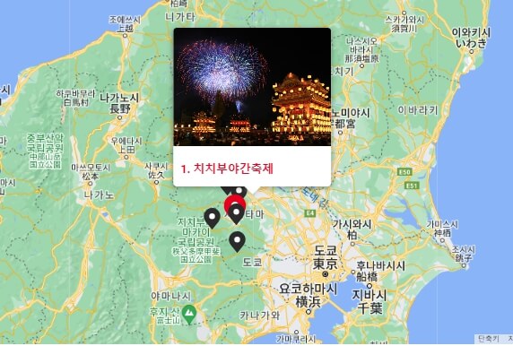사이타마현의 치치부 야간축제 는 매년 12월 2일과 3일에 열리는 최소 3백 년의 역사를 가진 야간 축제이며 간토 지역에서 가장 화려한 행사 중 하나입니다. 축제에는 음악과 플루트에 맞춰 10~20