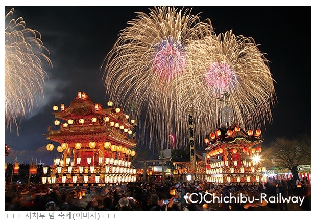 '치치부 야간 축제'는, 에도 중기( 350여 년 전), 치치부 신사에 있는 실크 직물의 도시인 키누노 타카마치의 경제를 살리기 위해 시작되었다고 하며 축제에 대한 사람들의 호응도가 높아지면서, 더 발전시켜 일본을 대표하는 축제로 자리 잡게 되었습니다. 2016년 유네스코 위원회 협의에 의해 '치치부 야간 축제'의 행사와 '카구라'(神楽:Kagura: 신에게 제사 지낼 때 연주하는 음악)가 유네스코 무형문화재에 등록되었습니다. 이 '치치부 야간 축제'는 화려하게 꾸며진 대형 장식물인 카사보코와 야타이가 북과 피리소리에 맞추어 시청옆 광장의 가파른 비탈길로 이동하면서 관광객들의 흥을 돋우며 이후에 추억으로 깊게 간직해 줄 겨울 밤하늘 위로 축하 불꽃놀이가 진행됩니다.