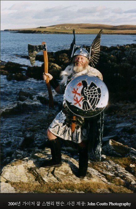 Up Helly Aa는 1880년대에 시작되어 역사와 전통이 있는 축제이며, 그 이후로 지금까지 이 축제는 셰틀랜드에서 매년 개최되었습니다. 축제날 하루종일 역사를 기념하며, Jarl Squad의 리더인 '가이저' (Guizer) '족장'(Jarl)인 Chief Guizer와 함께 마을을 행진하고 갤리선을 타고 홀의 저녁파티 분위기를 마음껏 즐깁니다. 가이저 족장의 복장은 기록에 옛부터 잘 설명되어져 있습니다. 가이저 족장은 까마귀 날개가 양쪽에 솟아 오르는 은색 헬멧을 쓰고, 은색 갑옷 소매가 달린 코르셋을 착용하고 있으며 다리에는 검은 스타킹과 십자가 모양으로 교차한 생가죽 샌들을 신고 거대하고 무거운 은방패로 앞을 가리고, 허리에는 은머리 전투 도검과 도끼를 차고 있는 늠름한 모습입니다.