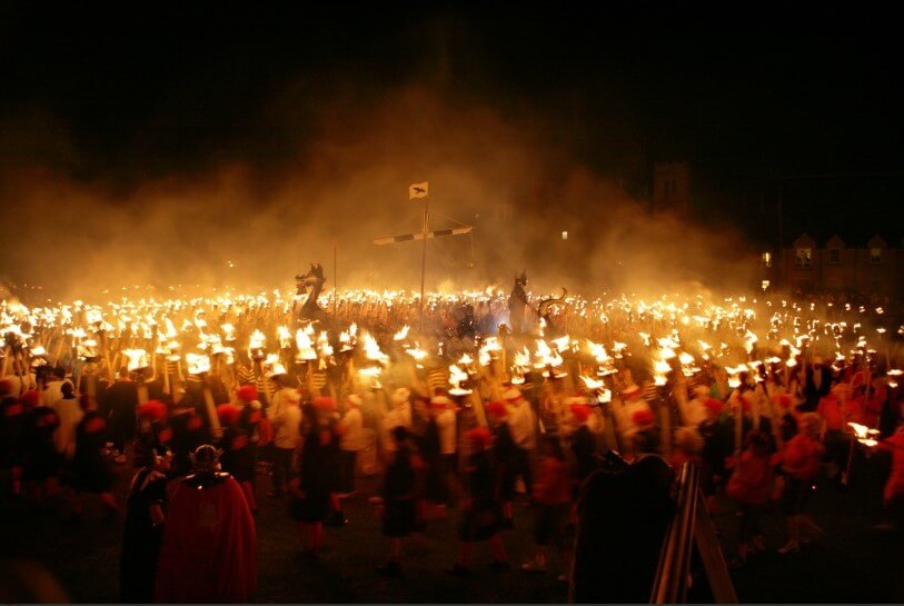 마지막으로 바이킹선인 갤리선을 불태우는 의식을 진행합니다. 그전에 화려한 불꽃놀이로 축제 분위기를 돋우고 갤리선을 불태우기 시작합니다. 배를 불태우며 밤새도록 파티를 열어 서로를 축하하며 즐깁니다. 영국 국내는 물론이고 유럽 여러 국가에서 이 유서 깊은 축제를 보기 위해 이곳 셔틀랜드의 러윅을 방문하여 축제를 즐깁니다.
