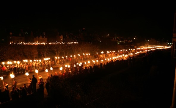 세계적으로 관심을 가지고 있는 유명한 횃불 행렬은, 횃불을 들고 마을을 통과하며 발할라를 향하는 넓다란 길을 갤리선을 따라가는 1,000 여명으로 이루어진 가이저로 구성이 됩니다. 관중들 5,000여 명이 둘러싸고 지나갈때마다 응원의 힘과 함성을 보냅니다. 분대는 1월 30일 19:00부터 Hillhead에 집결하여 19:30부터 횃불을 붙이기 시작합니다. 어둠이 짙게 깔린 가로등도 없는 거리가 불이 켜질때마다 살아있는 붉은 불이 용처럼 점점 커져가고 있는 모습은 정말 경이롭고, 그야말로 장관입니다.