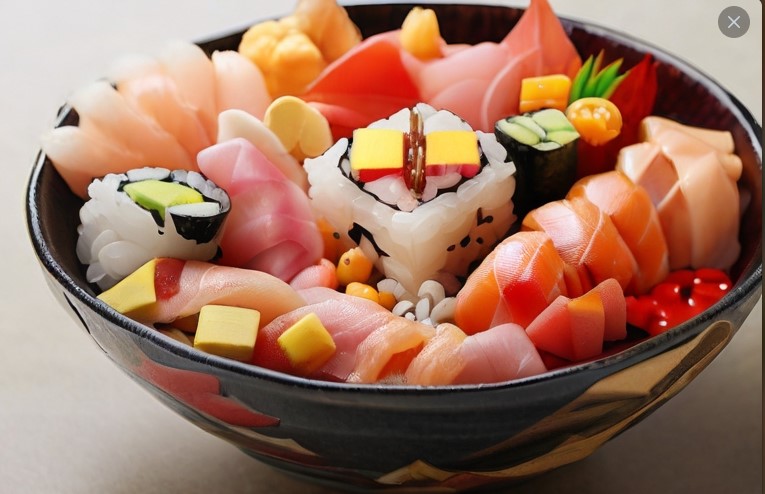 다채롭고 예쁜 색깔의 생선과 야채를 얹어 식초, 소금 등으로 간을 한 일종의 회덮밥입니다. 이때 꼭 새우가 필수적으로 들어가는데 이는 새우가 긴 수명을 의미하기 때문입니다.