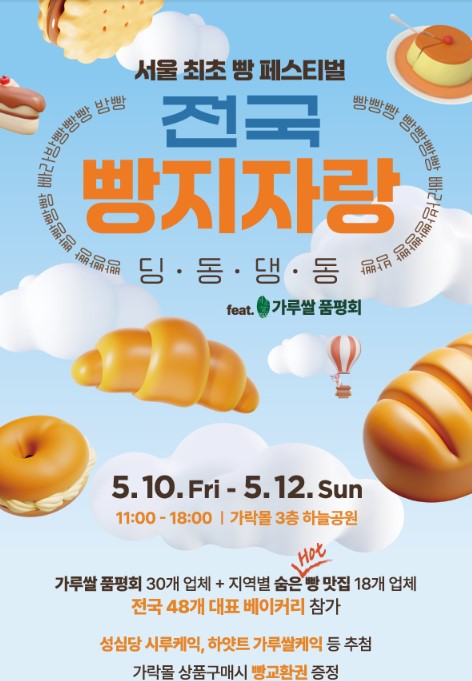 전국 각지 농수산물이 모이는 서울시 송파구 가락몰에서 전국 각지의 빵집을 모아 서울 최초로 '전국 빵 축제'를 개최한다. 5/10(금)~5/12(일), 3일간 약 25여 개의 전국 유명 빵집들과 가락몰에서 유