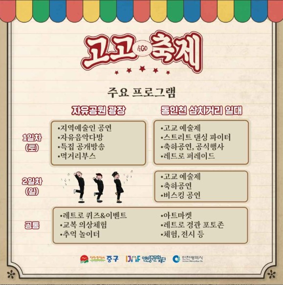 추억과 낭만의 학창시절을 함께했던 그 때 그 시절 동인천으로 돌아가는 레트로 복고축제이다. 자유공원 광장과 동인천 삼치거리 일대에서 펼쳐지는 다양한 레트로 프로그램(레트로 경관 포토