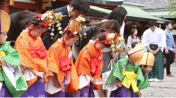 오후 2시 30분부터 히에 신사에서는 치고 행렬이 진행되는데 어린아이들이 건강하게 자라기를 바라며, 귀여운 옛 의복을 깨끗하게 입고 하느님이 은혜를 받게 됩니다.