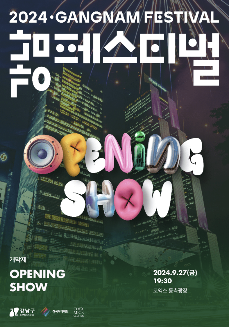 지금까지 삼성역 코엑스 동측 광장 메인 무대에 펼쳐질 강남 페스티벌의 '2024 오픈 에어 콘서트(9/28)'와 그 전날 행사 '2024 오프닝 쇼(9/27)'에 대해 설명드렸습니다. 9월 마무리하는 마지막 주말을 장식하는 화려한 레트로 콘서트와 예술 공연은 이 가을을 맞이는 우리의 마음을 풍요롭고 풍성하게 해 줄 것입니다. 그럼 안전하고 즐거운 공연 관람하시기 바랍니다.