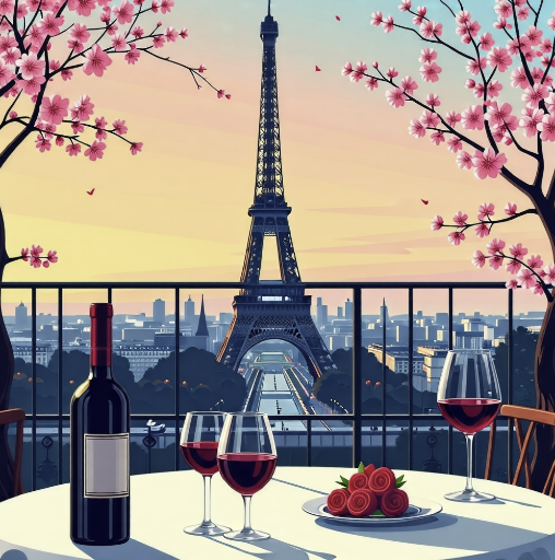 몽마르트르 와인 축제 2024 포스터와 에펠탑 배경의 여인