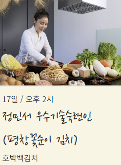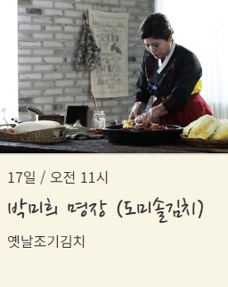 김치 명인이 직접 만드는 김치의 제작과정을 보며 맛볼 수 있는 기회.