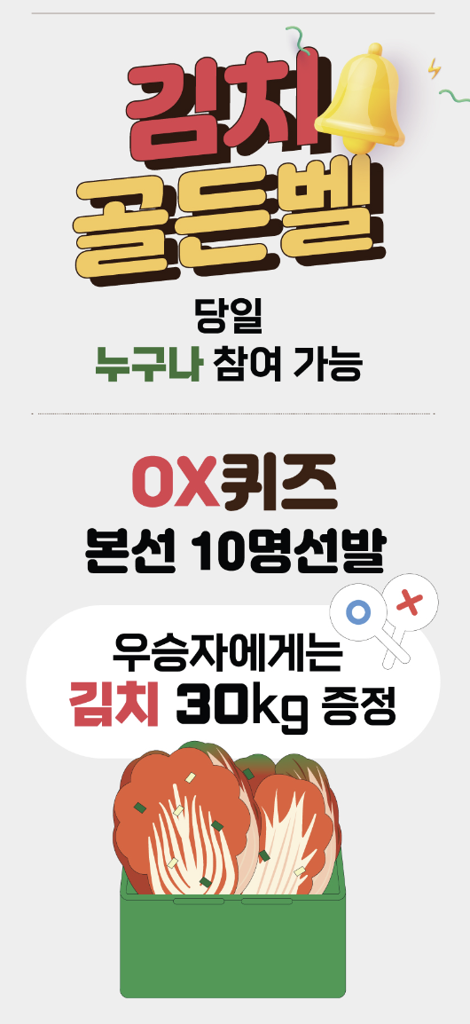 이번 이벤트에서는 김치 축제의 재미와 볼거리를 제공합니다. 김치축제에 참여한 관람객이라면 누구나 참여하는 이벤트, 골든벨 우승자에게는 김치 30kg 선물 증정