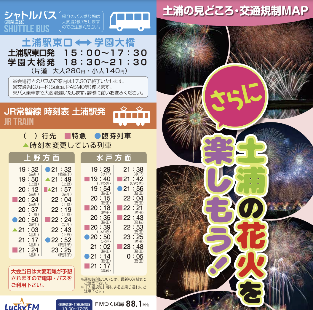 이번 불꽃놀이 대회도 45만 명의 인파가 예상되므로 대회장까지 가는 길은 매우 편리하게 되어있습니다. JR 츠치우라 역, 혹은 버스터미널에서 쉽게 셔틀버스를 타고 대회장까지 갈 수 있습니다. 셔틀버스 시간과 장소는 하기의 표를 참조하세요.
