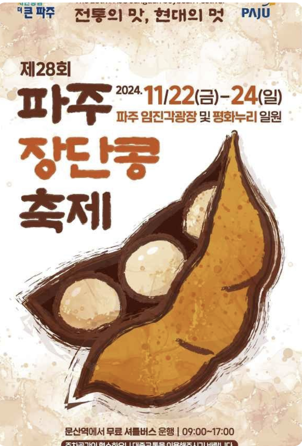 오늘은 올해로 28회를 맞이하는 파주 장단콩 축제에 대해 설명드리겠습니다. 옛날과 현재 그리고 '전통과 현대가 만나는 장단콩 이야기'라는 주제로 개최되는 파주 장단콩 축제가 바로 오늘 11월 22일(금) ~11월 24(일)까지 파주의 임진각 광장에서 축제가 열립니다. 장단콩 축제 이름만 들어도 뭔가 옛날의 향기가 느껴지지 않으세요? 바로 이번 축제에서 느끼실 수 있습니다. 그럼 축제의 현장으로 같이 가보시죠.