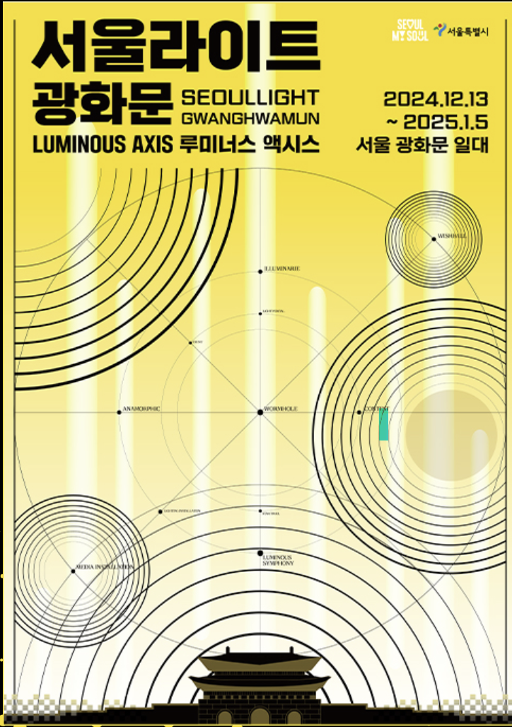 광화문 광장의 또 하나의 어마어마한 이벤트, 12월 13일 광화문 마켓이 시작하는 날부터 광화문 일대에 미디어아트와 문화 예술 콘텐츠로 구성된 라이트( Light) 빛 축제인 '2024 서울라이트 광화문 미디어아트 프로젝트 [루미너스 액시스_Luminous Axis] 도 열립니다. 서울의 현재와 미래 비전을 예술적으로 담아내며 미디어아트가 창조하는 빛과 소리의 울림을 통한 공감각적 체험 기회를 제공합니다.
