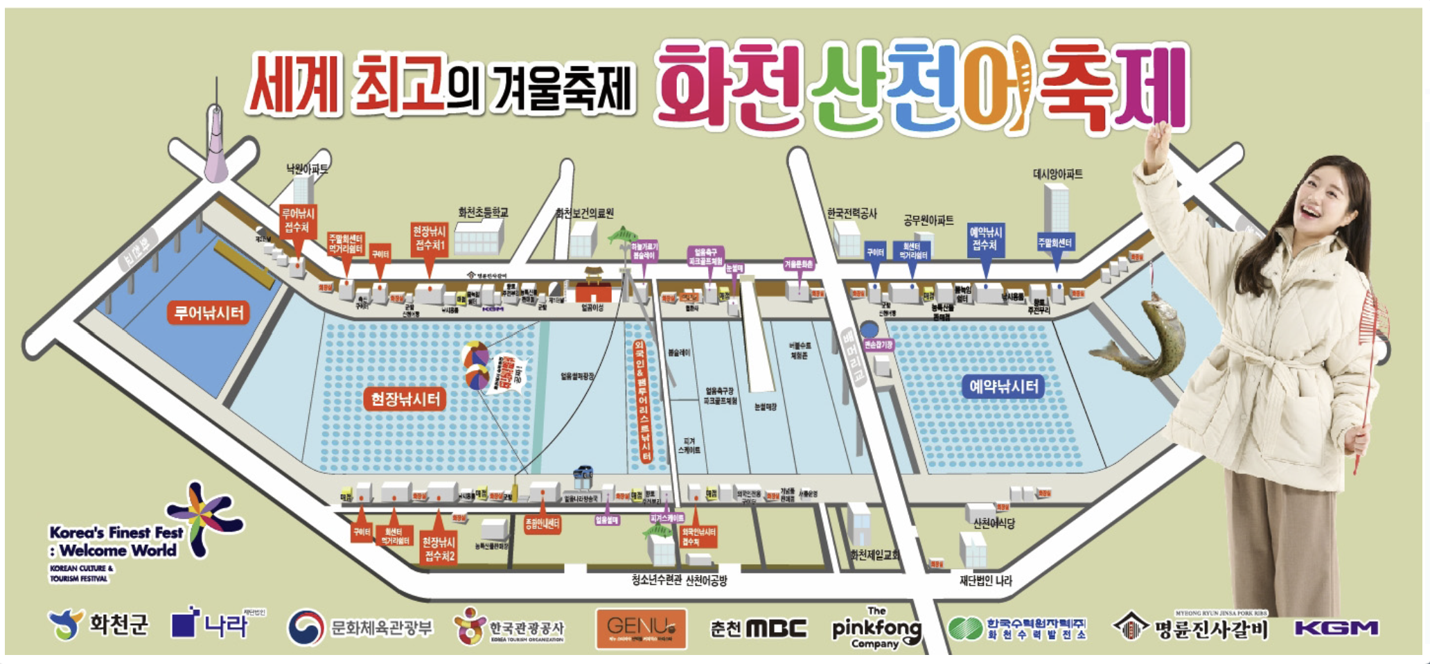 | 축제 장소 | 강원특별자치도 화천군 화천읍 일원 : 현장 접수 얼음낚시터, 예약접수 얼음낚시터 다른 장소로 구분 |