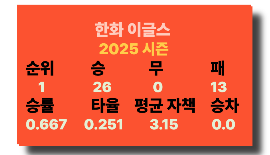 한화 이글스는 2025 시즌 동안 매우 성공적인 성적을 기록하고 있으며 현재까지 39경기를 치렀습니다. 그중 26승 13패를 기록하고, 무승부는 없었고 승률은 0.667로, 이는 그들이 모든 경기의 약 66.7%를 이겼음을 의미하고 있으며 이로 인해 리그 순위에서 1위를 차지하고 있습니다. 승차가 0.0으로 다른 팀과의 승리 간격이 없음을 나타냅니다.