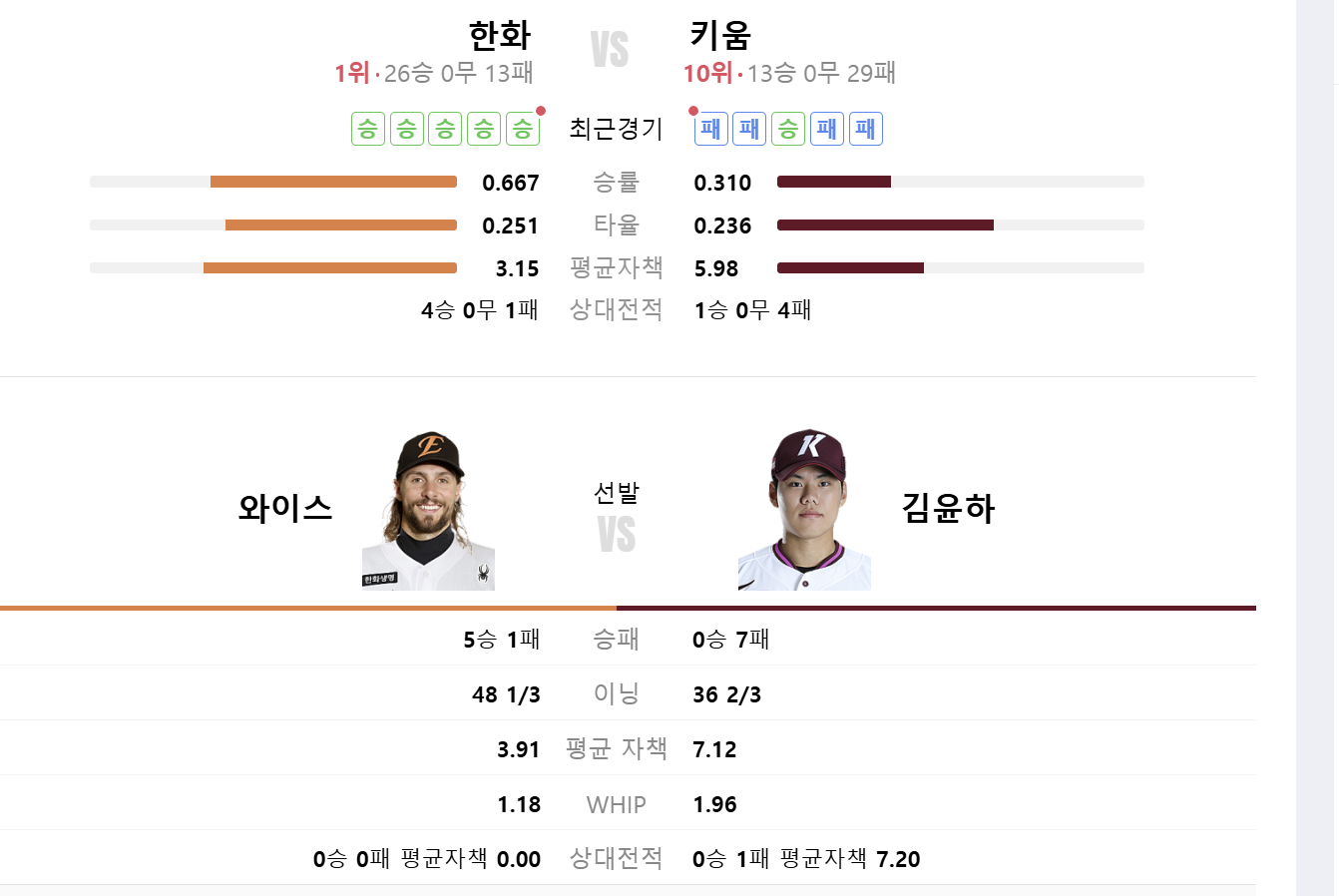 한화 이글스의 선발 투수 '와이즈'와 키움 히어로즈의 선발투 ' 김윤하' 2025년 시즌 기록 비교