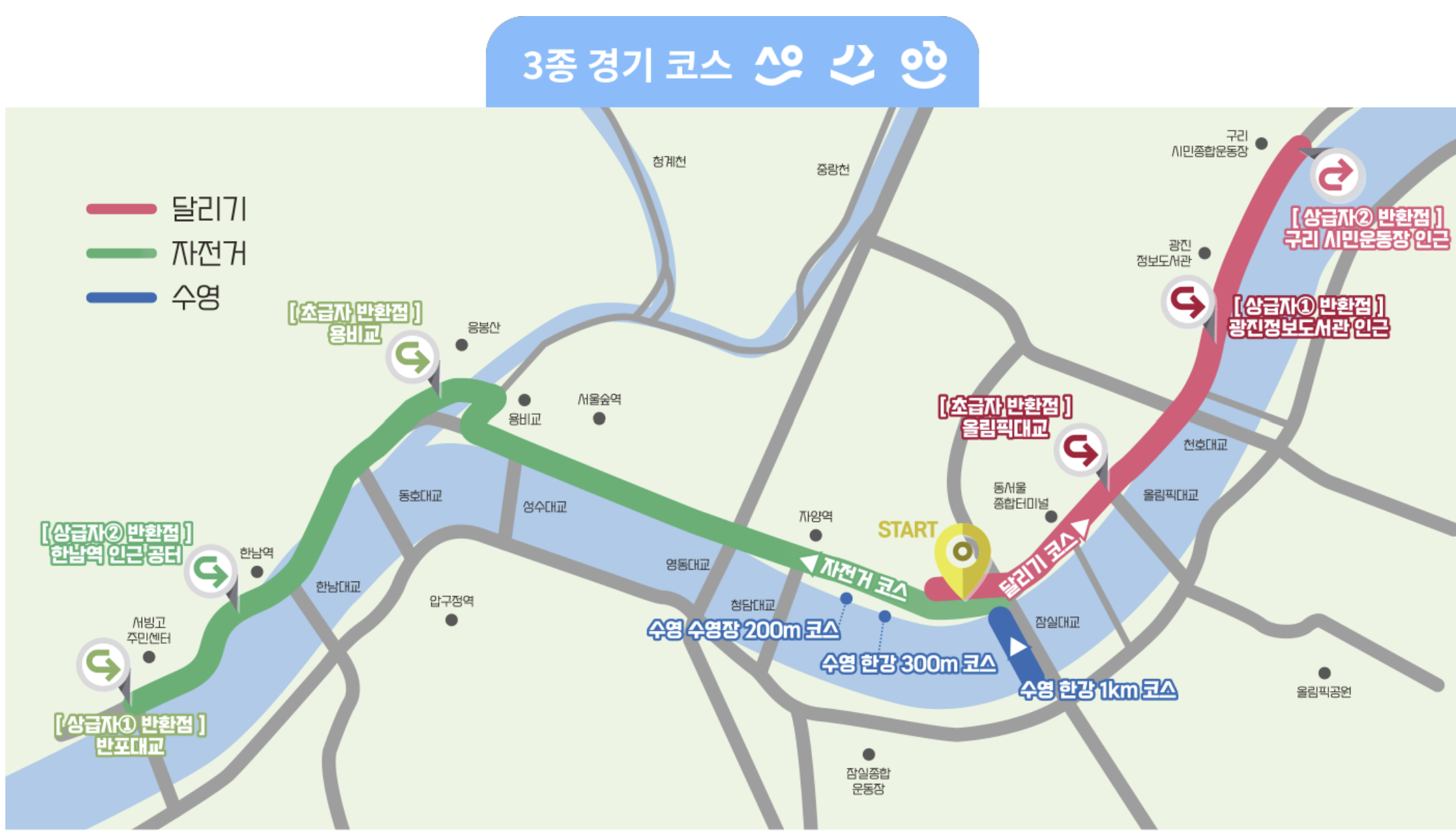 대회 종목 : 수영, 자전거, 달리기 3종