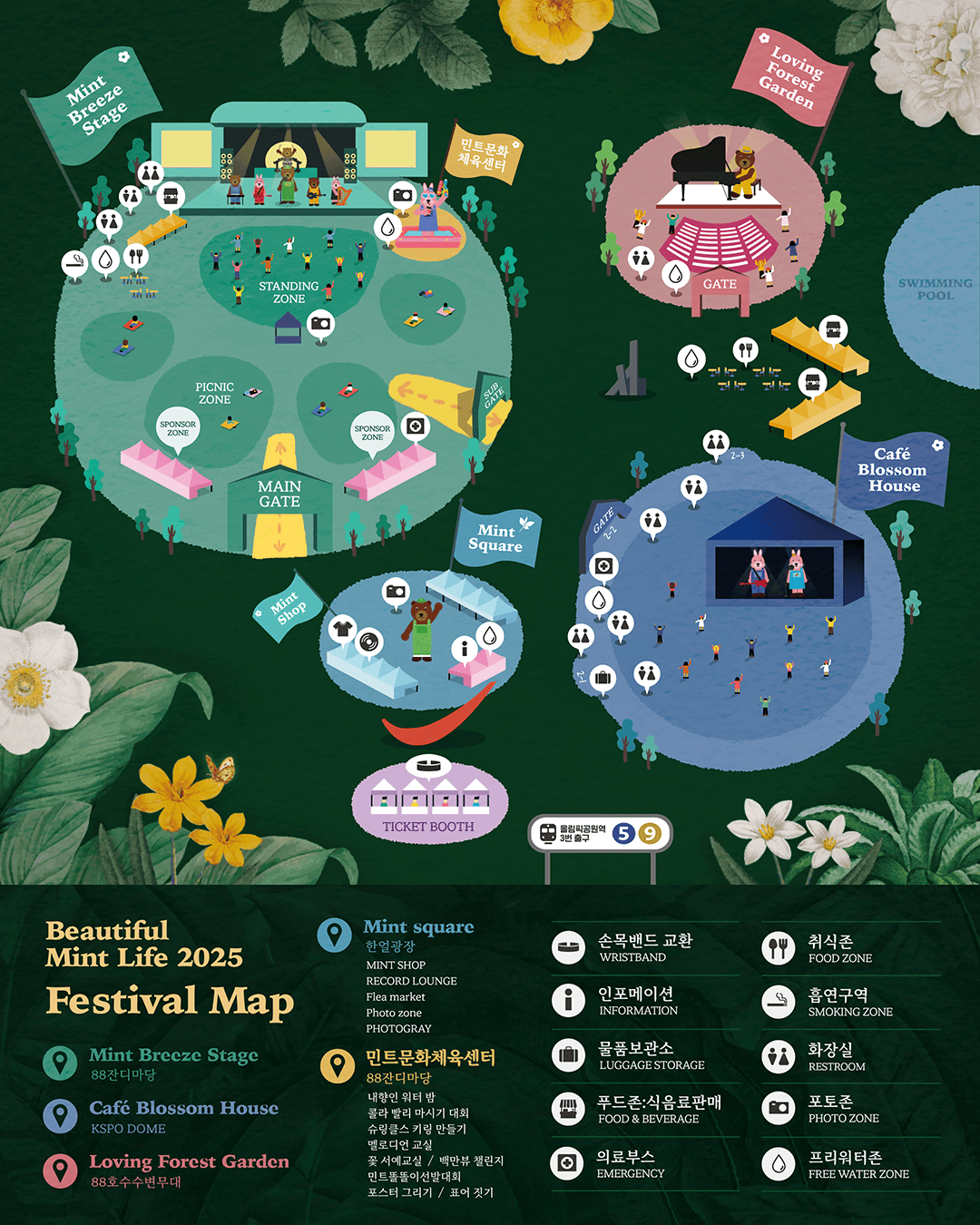 | 공연 스테이지 | Mint Breeze Stage – 88잔디마당 Café Blossom House – KSPO DOME Loving Forest Garden – 88수변무대 |