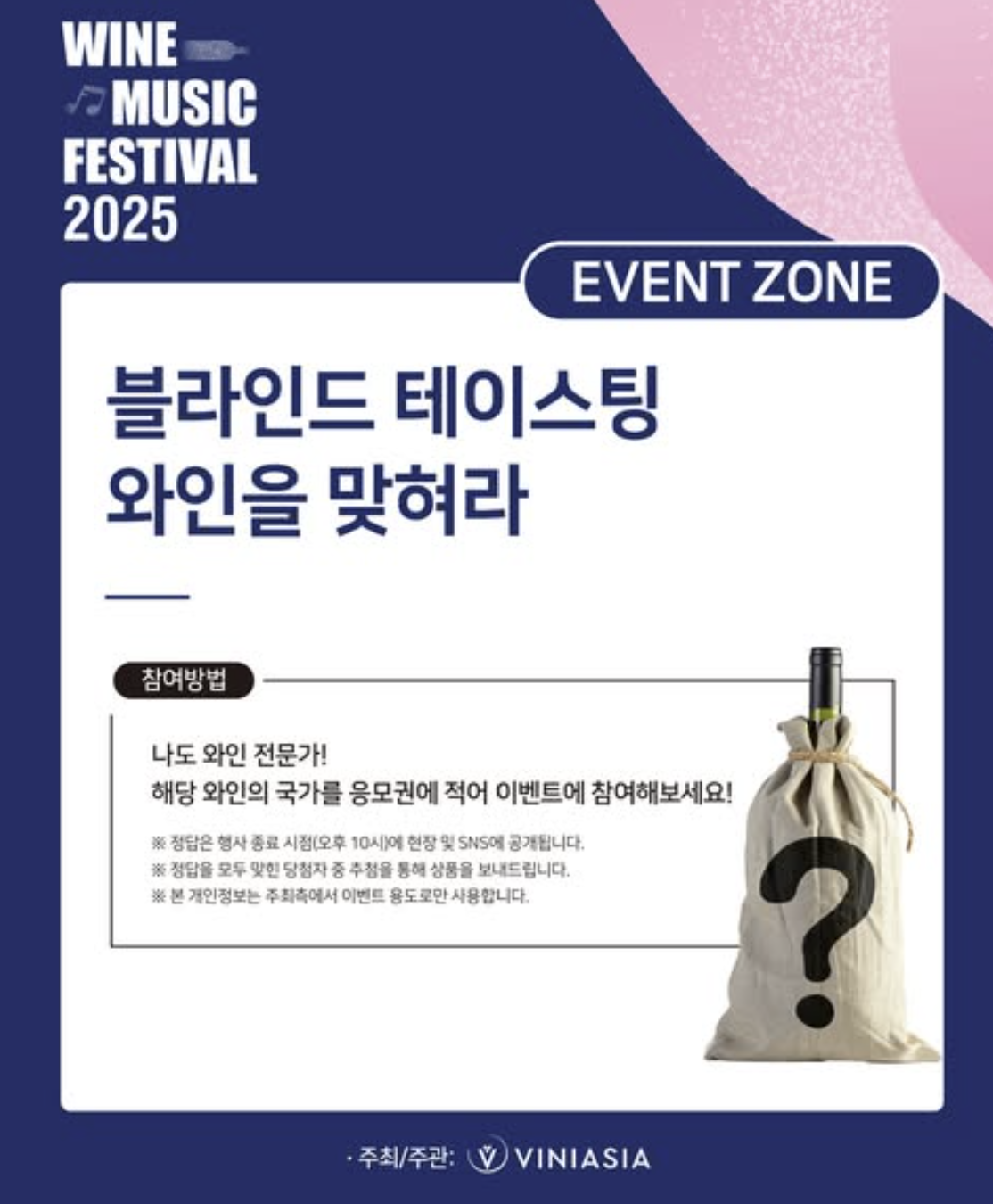 | 와인뮤직 페스티벌 일정 및 시간 | - 2025년 6월 13일(금) ~ 6월 15일(일) - 행사 기간 매일 오후 4시 ~ 오후 10시까지 |