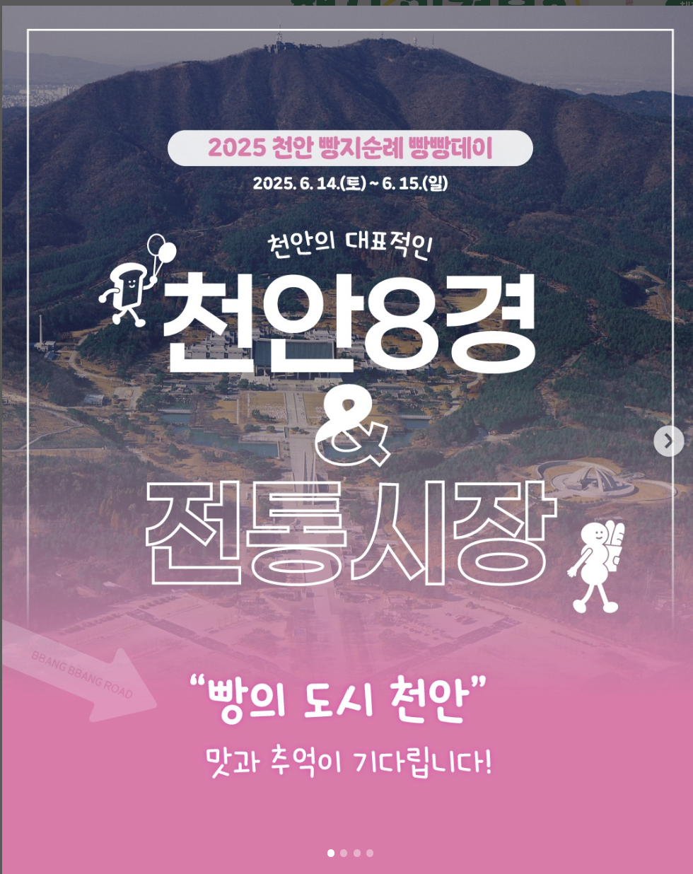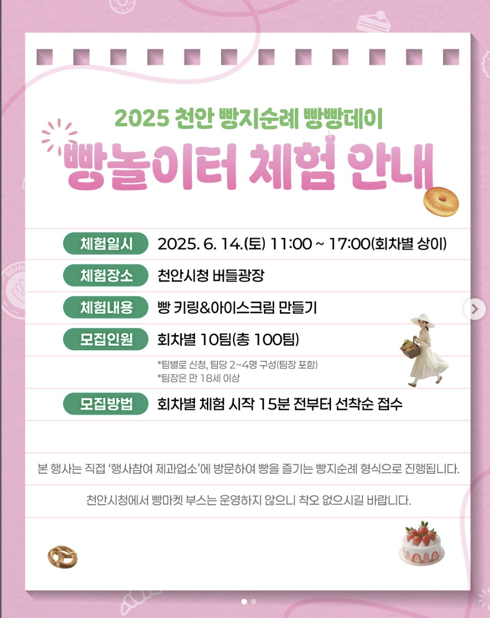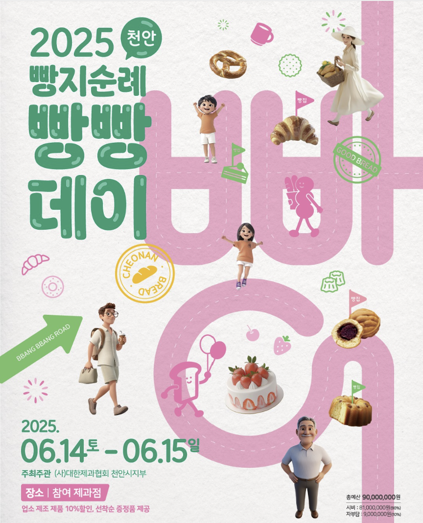 이상으로 2025 천안 빵지순례 빵빵데이에 대해 설명드렸습니다. 이번 빵지순례 빵빵데이는 단순한 빵 행사 이상의 의미를 지닌 지역상생형 빵 축제입니다. 전국 빵지순례단과 함께 지역 동네빵집을 활성화하고 천안의 맛과 매력을 전국에 알리는 좋은 기회이기도 합니다. 가족, 연인, 친구와 함께 천안 시내 곳곳을 거닐며 맛있는 빵과 풍성한 체험을 즐겨보시기 바랍니다. 천안8경과 전통시장 방문 미션도 함께 진행되니 빵과 여행을 모두 잡을 수 있는 절호의 기회랍니다. 그럼 이번주 6월 14~15일, 천안 빵의 도시에서 빵지순례 떠나보시죠! 안전하고 즐거운 빵지순례가 되시기 바랍니다.