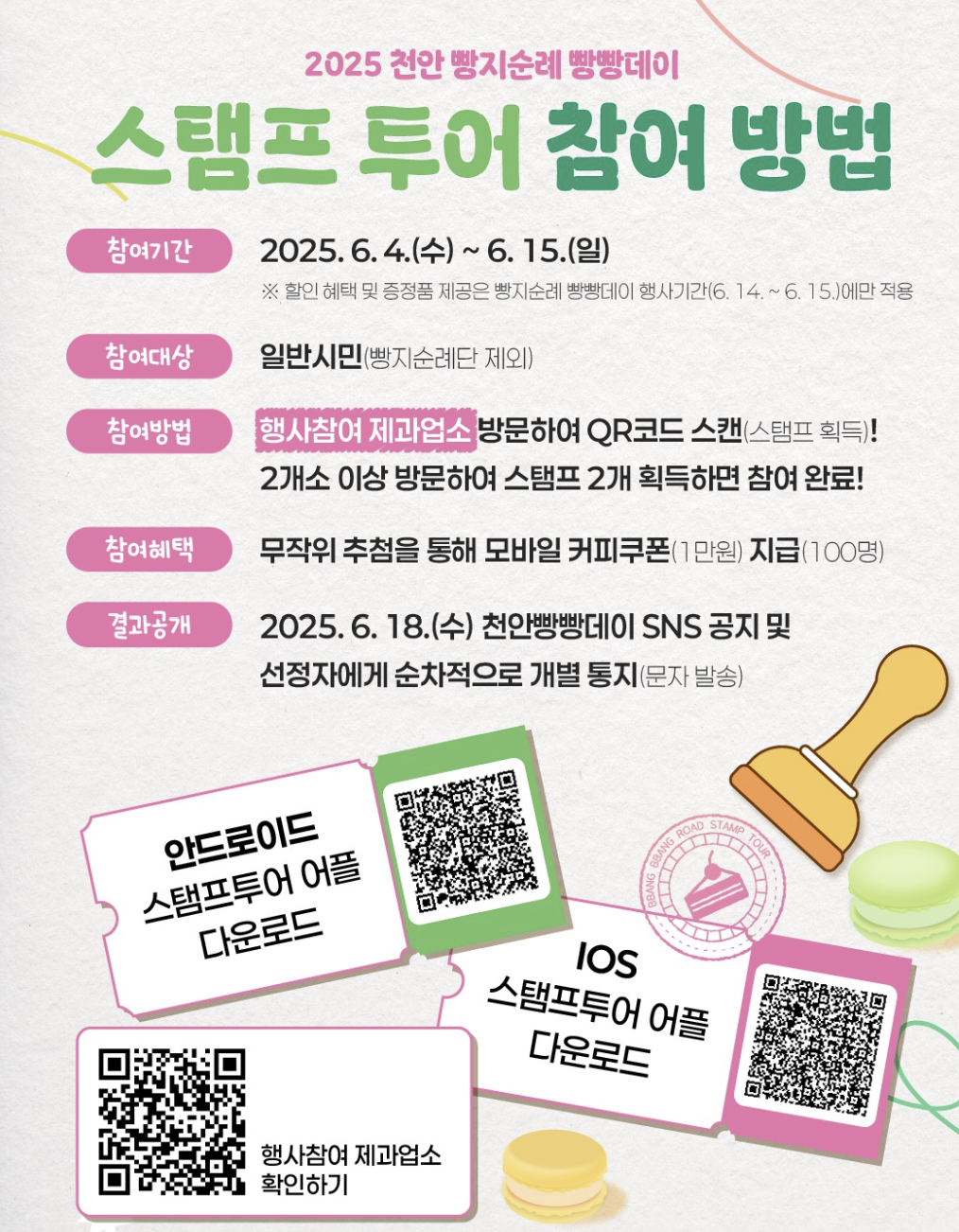 제과업소 2곳 이상 방문 후 QR코드 인증하면 모바일 커피 쿠폰이 제공되오니 많은 참여 바랍니다. K-컬처박람회 & 충청남도민체전 기간(6월 4일~15일) 동안 운영되오니 빵 투어 + 스탬프 투어 병행하면 더 재미있게 즐기실 수 있습니다!