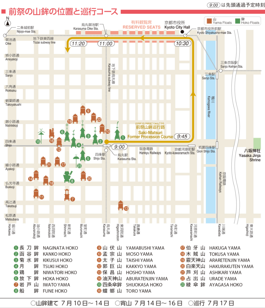 ② 신코사이( 神幸祭 :Shinkousai)날짜 — 17일: 전통 가마 행렬이 교토 시내 여기저기 눈에 띕니다. 가장 규모가 크고 볼거리도 풍성하며, 화려한 퍼레이드가 펼쳐지는 동안 단순한 피리소리, 북소리는 귀를 즐겁게 하며 언제나 흥에 겹습니다.( 사키준코라고도 합니다.)