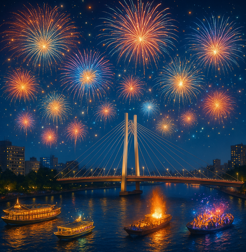7월 25일 밤, 수천 발의 불꽃이 하늘을 수놓는 Hanabi Time( 불꽃놀이 시간)이 시작되면 축제의 열기는 절정을 맞이합니다. 이 순간을 보기 위해 수많은 관광객들이 모이며, 붉은빛 저녁노을과 함께 터지는 폭죽 장면은 잊지 못할 추억이 됩니다.