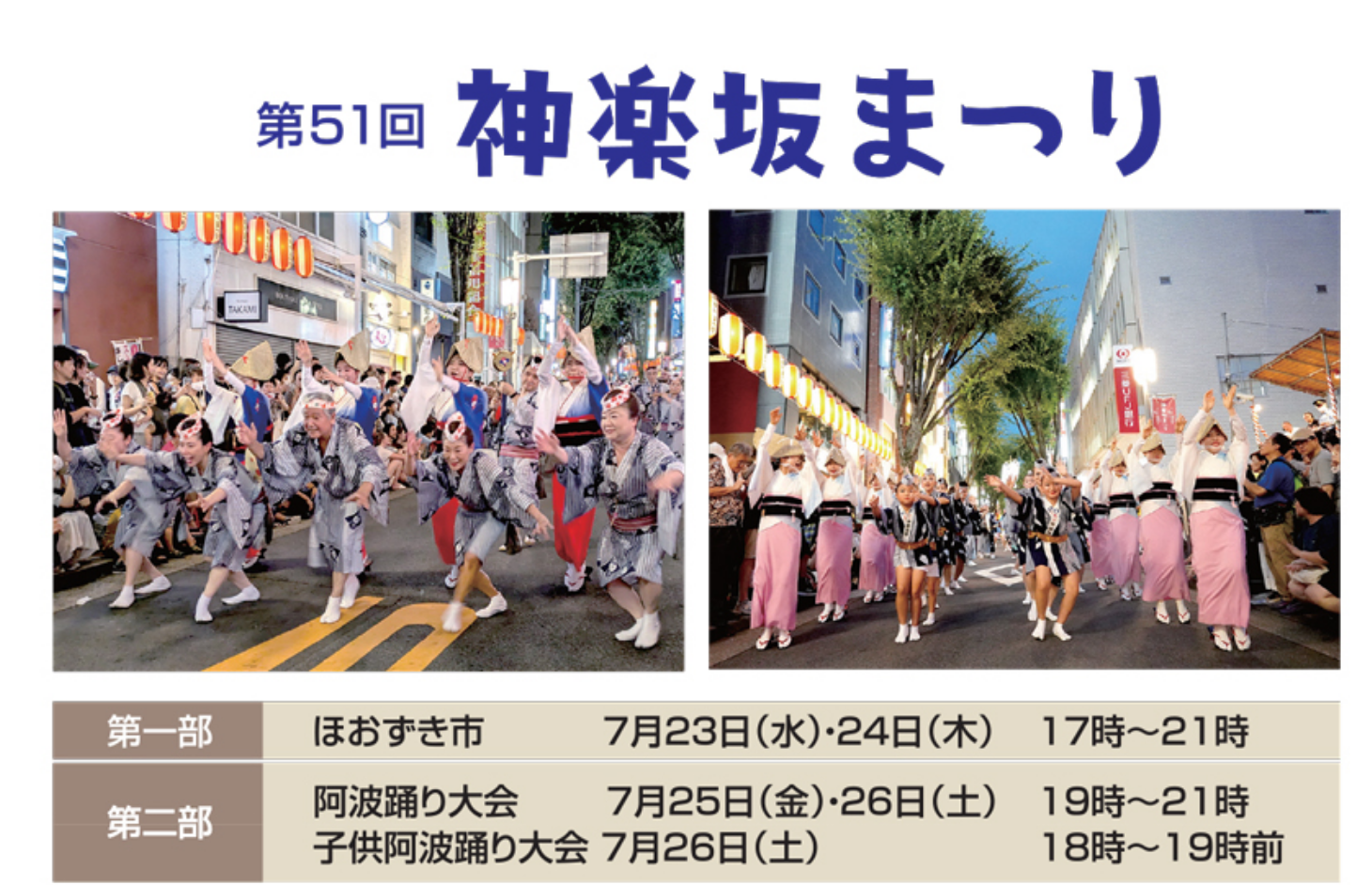 | 7/25~26 | 아와오도리 대회 | 19:00~21:00 | 가구라자카 거리 일대 |