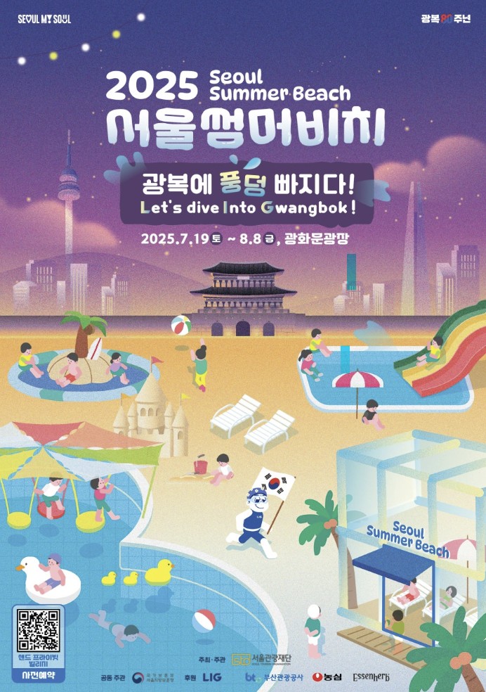 이번 행사는 서울관광재단이 주최·주관하고, 광복 80주년을 기념해 국가보훈부 서울지방보훈청과 함께 공동으로 주관하면 더 풍성하게 되었고, 또한 대한민국 대표 방산기업 LIG의 후원 아래 더욱 다채로운 프로그램으로 구성되었습니다. 축제는 세종대왕 동상 앞을 기준으로 나뉘며, 정면에는 휴게 공간인 샌드비치존, 후면에는 물놀이 공간인 워터비치존이 펼쳐지고, 이 외에도 어린이 전용 바운스 수영장이 별도로 설치되어 전 연령층이 함께 이 더운 여름을 시원하게 즐길 수 있습니다.