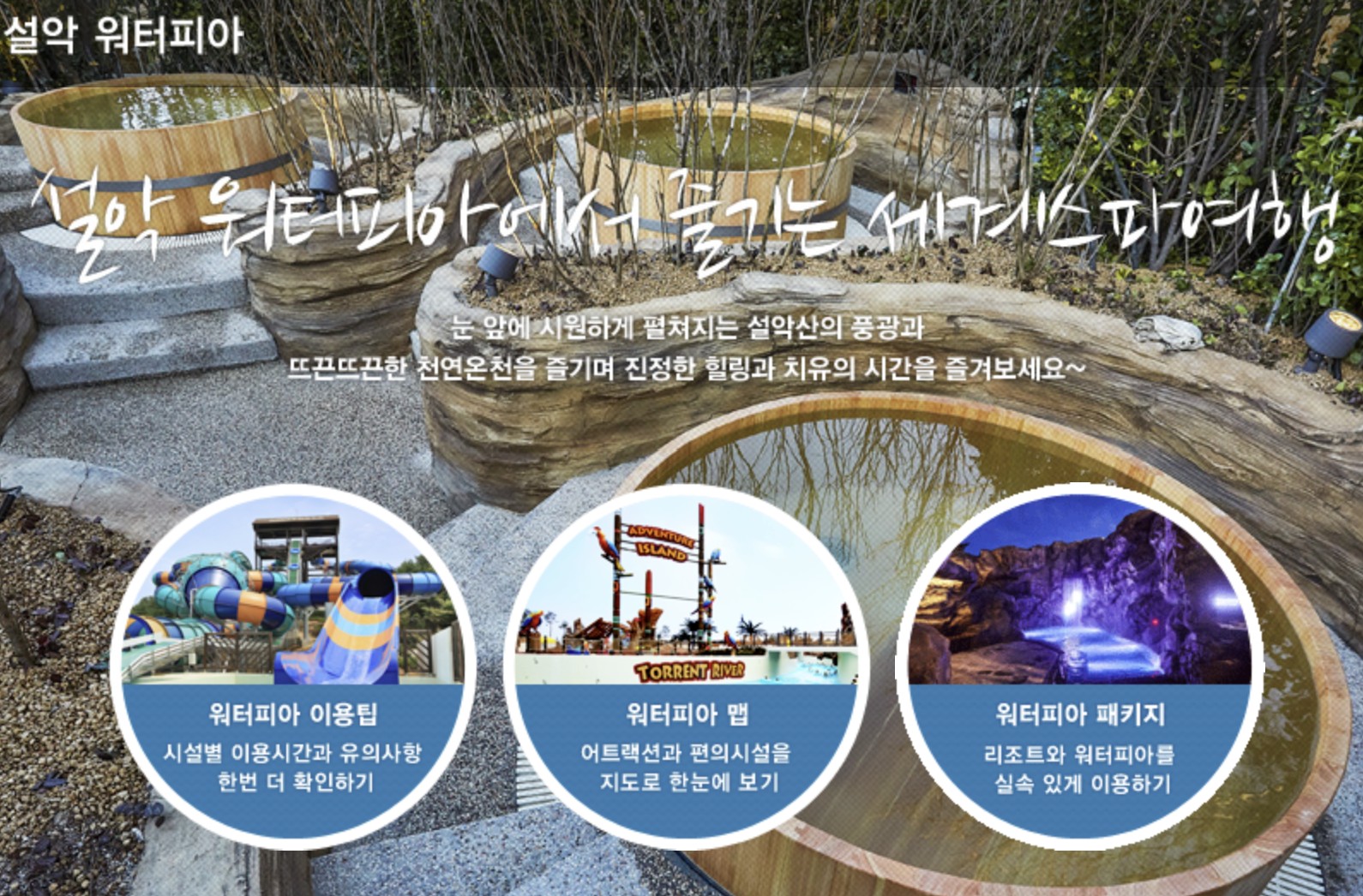 특징: 설악산 온천수를 활용한 자연친화 워터파크. 실내외 온천탕과 수영장이 어우러진 힐링형 워터파크. 사계절 이용 가능