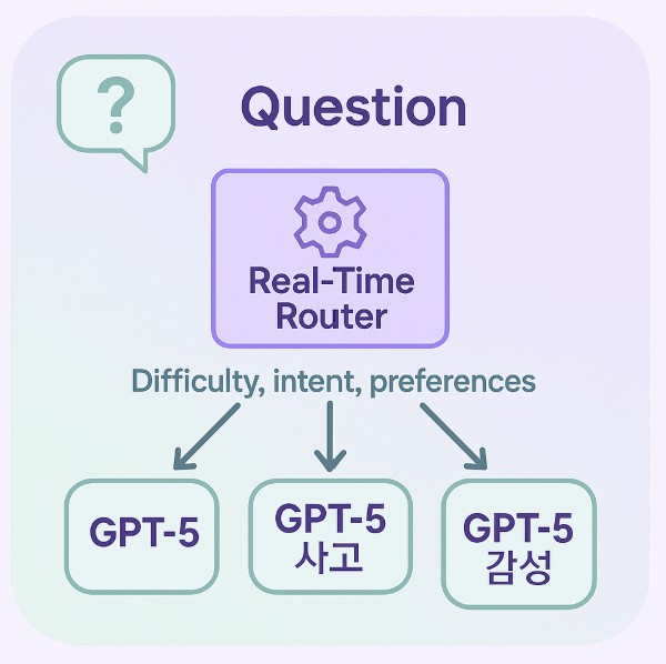 - GPT-5는 입력된 질문의 난이도, 주제, 복잡성을 자동으로 분석해 일반 모델 또는 심화 사고 모델로 라우팅합니다.
