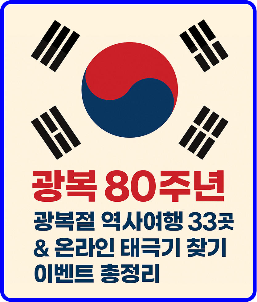 올해 2025년은 광복 80주년이 되는 뜻깊은 해입니다. 한국관광공사는 이를 기념해 ‘대한민국 구석구석 광복절 특집전’을 8월 31일까지 진행하며, 독립운동의 발자취를 따라가는 역사여행지와 온라인 태극기 찾기 경품 이벤트가 준비되어 있으니 꼭 확인해 보시기 바랍니다.