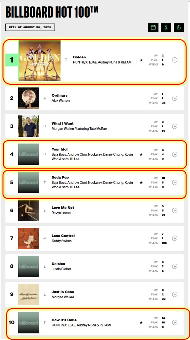 [속보] 케데헌│케이팝 데몬 헌터스, OST ‘골든’, 영국 싱글 차트 2주 연속 1위·빌보드 석권! 국