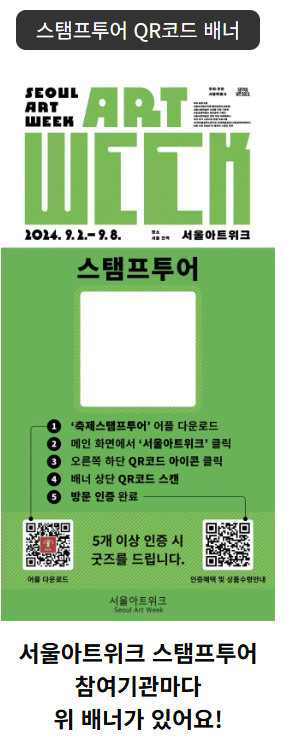 서울아트위크 참여 기관 5곳을 관람 후 앱으로 인증하면 스페셜 기념품 증정! 수령 장소 👉 뚝섬한강공원 안내소