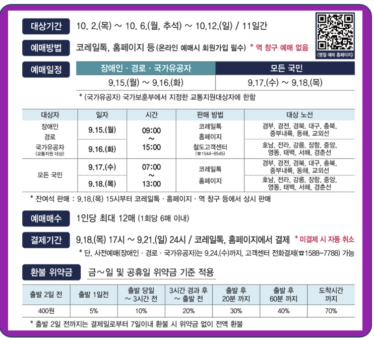 | 사전예매(대상자) | 9/15(월) | 09:00~15:00 | 경부·경전·충북선 등 | 앱/홈페이지/콜센터 |