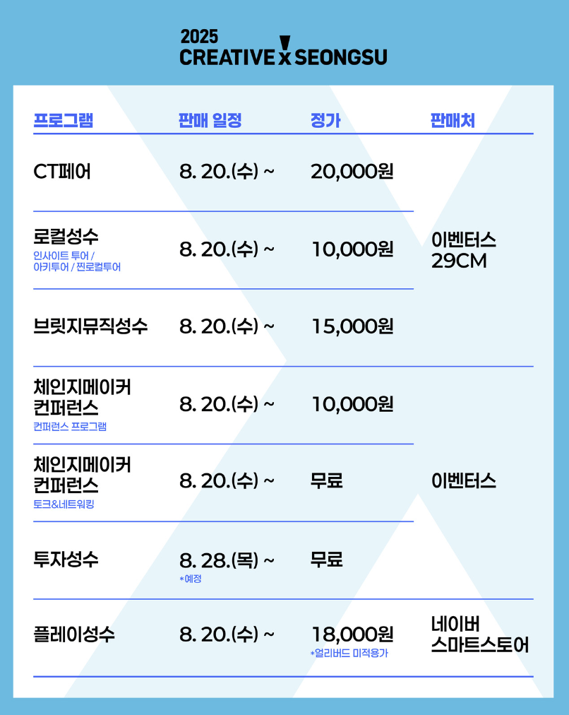 1차 얼리버드: 10,000원 (8/20~8/31)- 50% 할인 대상자: 플레이성수·로컬성수·브릿지뮤직성수 1종이상 구매자,: CT 페어