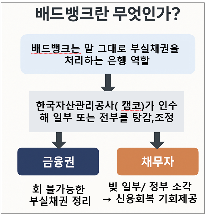 배드뱅크는 말 그대로 부실채권을 처리하는 은행 역할을 합니다. 금융기관이 회수하지 못한 장기 연체 채권을 한국자산관리공사(캠코)가 인수해 일부 또는 전부를 탕감·조정해 주는 구조입니다.