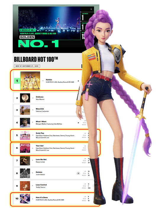 K-POP × ANIMATION케데헌 빌보드 싱글·앨범차트 동시 1위, 3억뷰 돌파, 케데헌 2 속편 확정케데헌은 2025년 9월 20주차 빌보드에서 싱글 차트 · 앨범차트 동시 1위를 차지하며, 빌보드 차트 중 가장 권