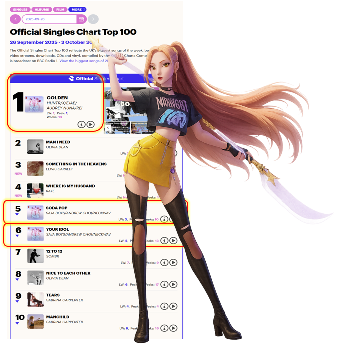 - 영국 오피셜 싱글—‘골든’ 8주 1위, 동시 다수 트랙 상위권 유지