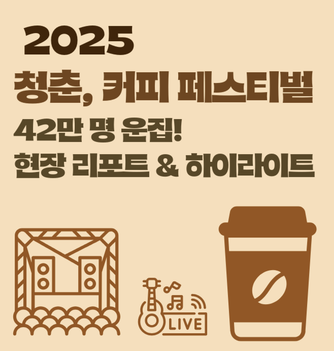 핵심 한 줄 요약: 이틀간 가족끼리 친구끼리 즐거움과 커피향 가득한 2025 청춘, 커피페스티벌에 약 42만 명이 다녀간 국내 최대 커피가을축제! 커피 3만 잔, 경품 8,158개, K-팝 라이브와 K-뷰티 체험까지—가족형 가을 대표 축제로 자리 잡았습니다.
