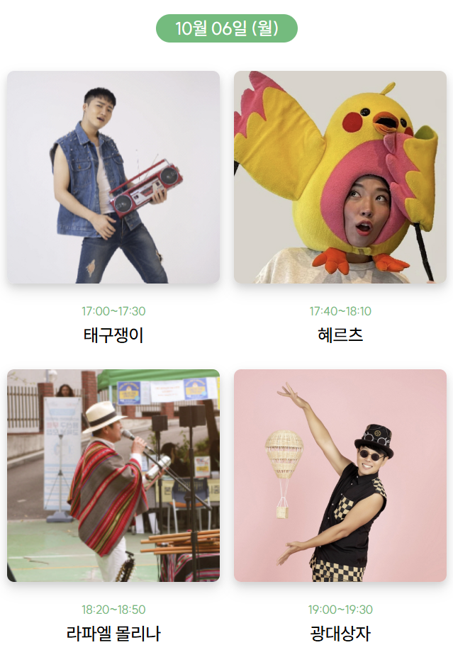 - 즐길거리 : 전통놀이(왕 제기차기·투호·대형 윷놀이), 구석구석라이브(10.6~10.8 / 17:30)