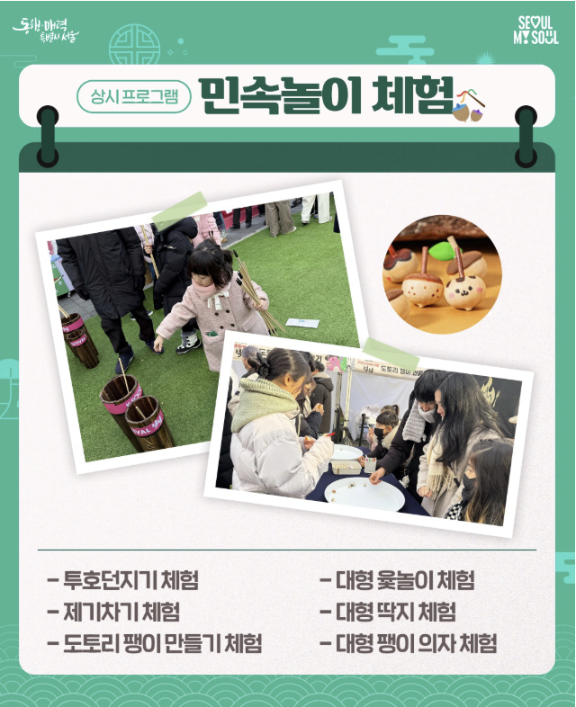 - 왕 제기차기/투호 체험 → 대형 윷놀이 경품 도전