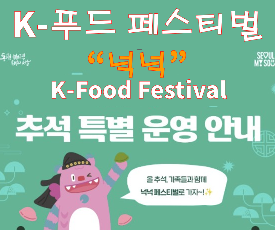 세종로공원에서 매주 사랑받는 한식 마켓 ‘넉넉’이 추석 시즌엔 10일 내내 오픈! 인절미닭강정·떡갈비버거·크림치즈 곶감말이 같은 K-푸드 시그니처에 전통놀이, 노을 감성 구석구석라이브까지. 이 글 하나로 운영시간·추천메뉴·놀이·포토팁을 한 번에 준비하세요. (공식:여기로 입장 K-푸드페스티벌 넉넉)