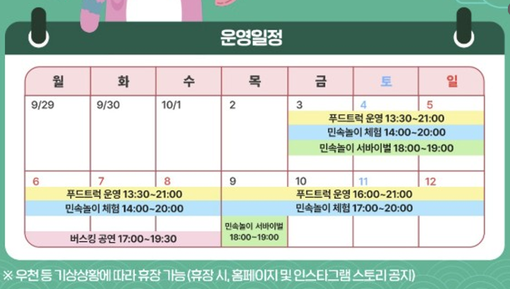 - 즐길거리 : 전통놀이(왕 제기차기·투호·대형 윷놀이), 구석구석라이브(10.6~10.8 / 17:30)