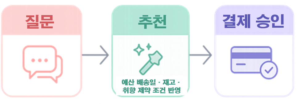 사용자는 “예산 범위, 사용 목적, 선호 브랜드, 배송일”을 한 번에 제시하고, 에이전트는 후보를 정렬·축약해 결정을 돕습니다.