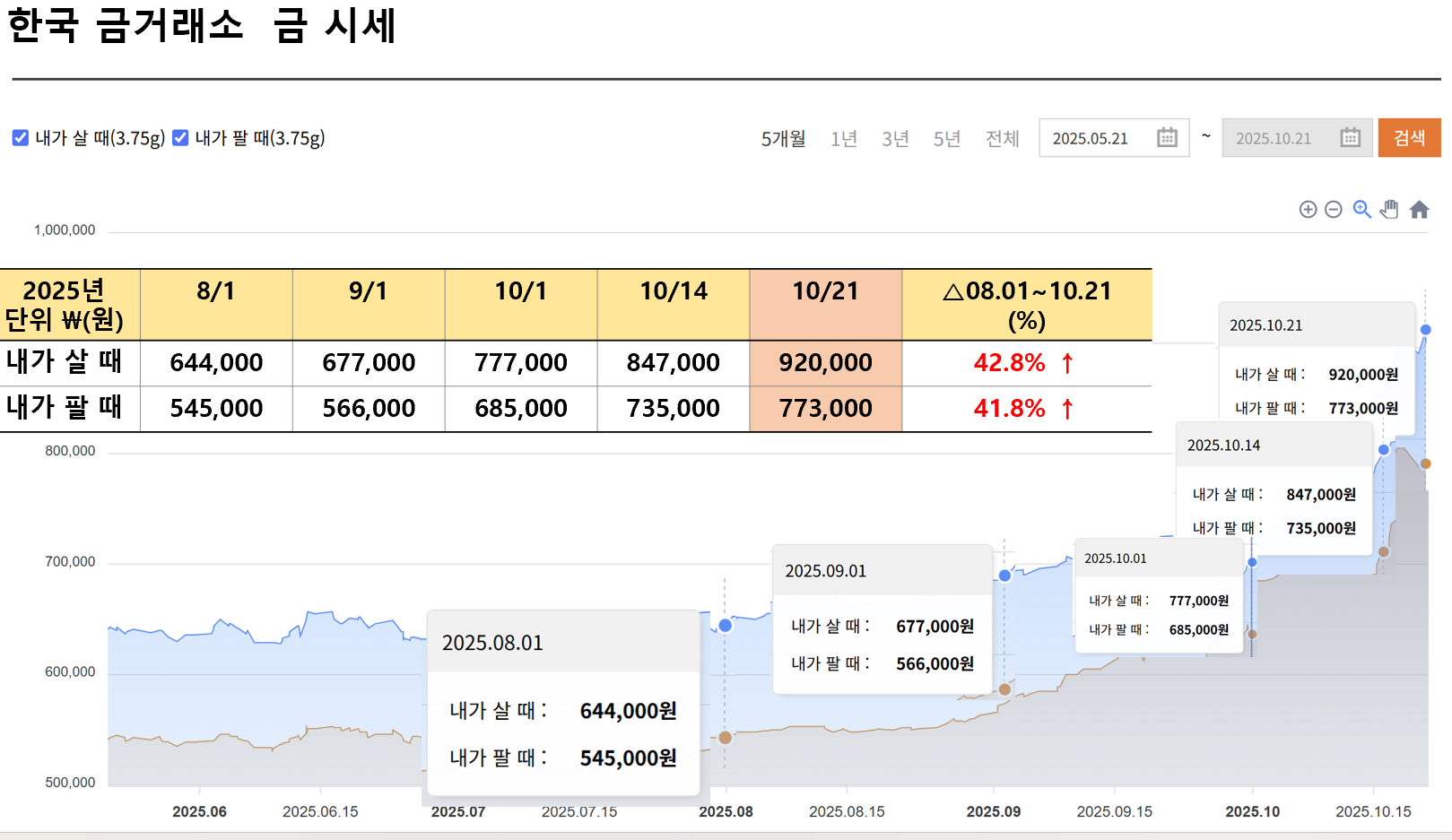금시세 : 내가 살 때 92만원, 내가 팔때 77.3만원 ( 10/21 기준)