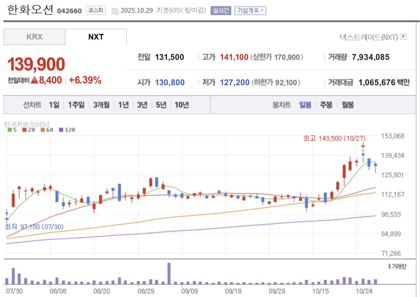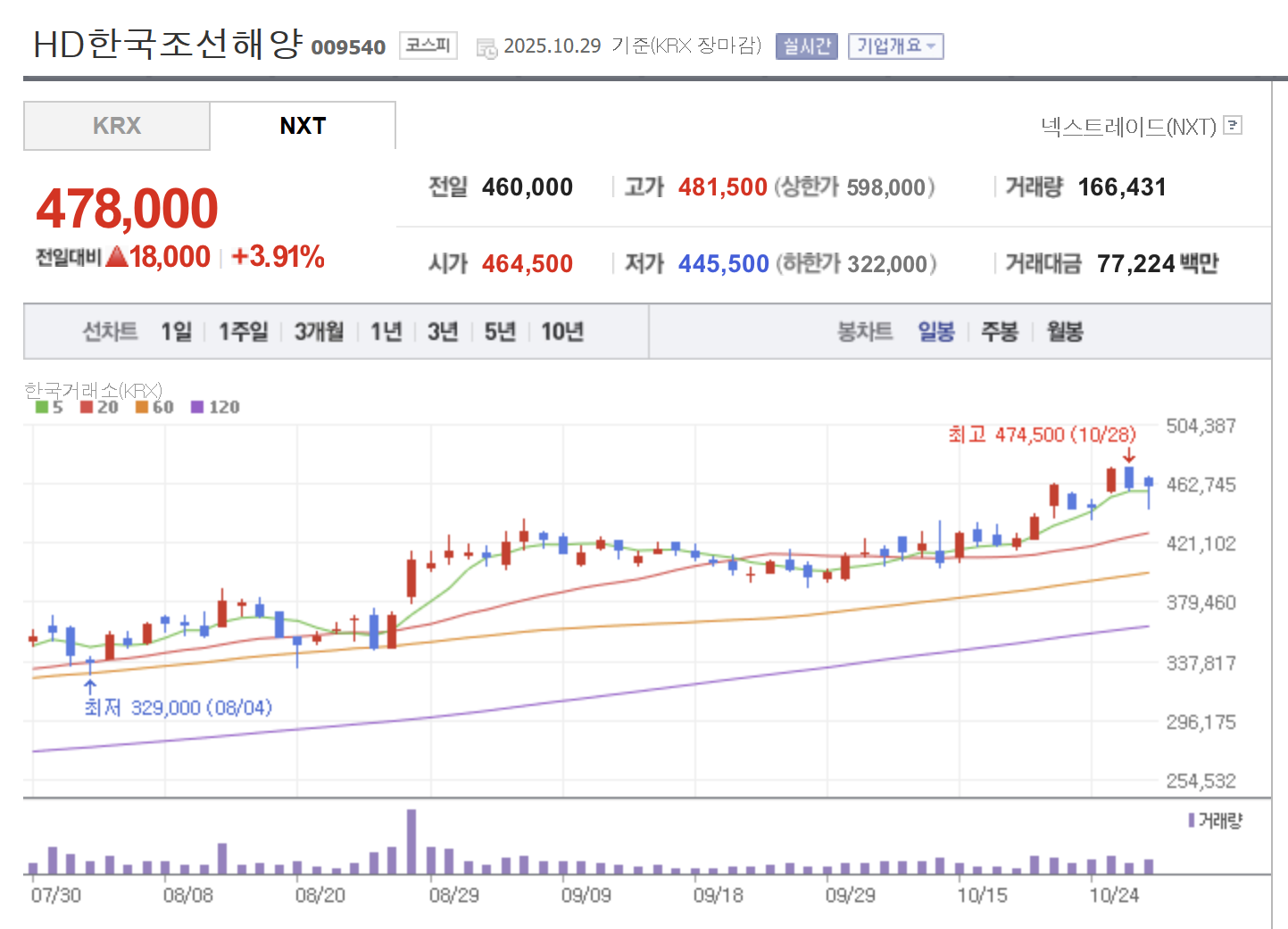 1. 조선업: 대표수혜주 일봉차트 ( '25.10.29)